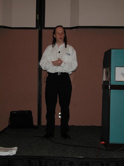 The evening's talk at the beer bash was given by Hugh Daniels, a politically active Linuxer, who leads (among other things), the IPSec FreeSWAN project. Hugh talked about the Russian coder, Dmitry Sklyarov, who has been detained without bail, in an unknown location, for coding something that is legal to do in his country and which allows people to exercise their rights under US Copyright law.